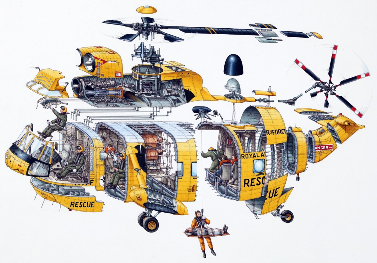 Stephen Biesty drew the helicopter cross-section above in a book called Incredible Cross Sections that I loved as a kid. It not only showed the inner workings of buildings and machines, but the purposes of people that used them.
